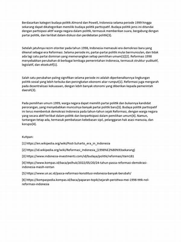 Di tengah dinamika tersebut, masih banyak faktor lain yang perlu dipertimbangkan. Misalnya, latar belakang sejarah suatu negara, perbedaan sosial, serta kemajuan ekonomi yang semua dapat mempengaruhi bagaimana budaya politik berkembang. Bagi para peminat studi politik, pemahaman mendalam akan kategori-kategori ini bisa membantu merumuskan kebijakan yang lebih sesuai dan efektif bagi negara dengan konteks politik yang beragam. Dengan kata lain, kajian ini adalah investasi berharga untuk pengetahuan politik kita di masa depan.